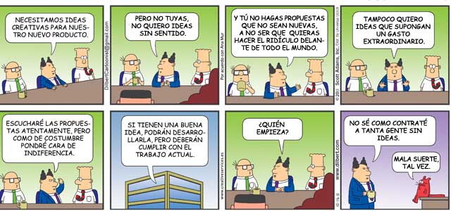 Hemos recibido de una colaboradora este comic de Dilbert, que sirve para ilustrar lo que es un marrón, y que a pesar de todo siempre hay que ser optimista